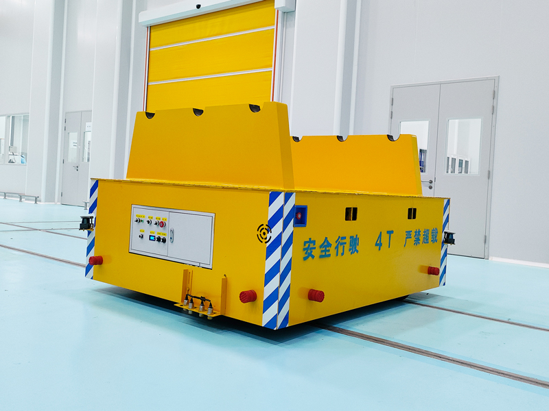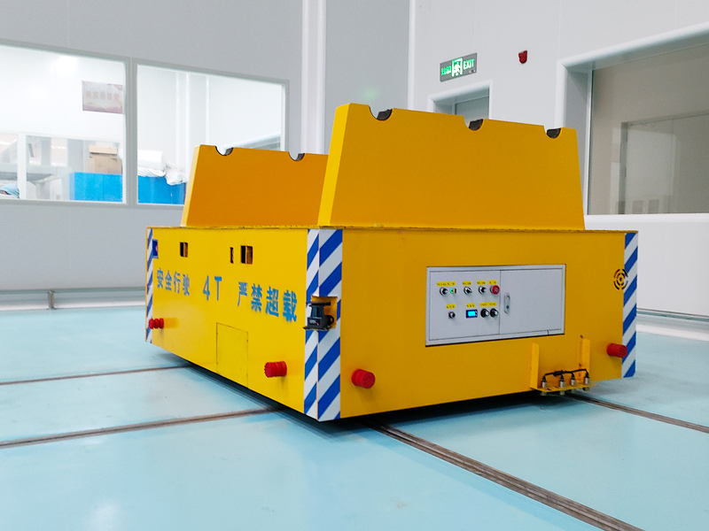 纵横移动轨道电动平车,该客户用于生箔车间、包装车间内的阴极辊和铜箔运输,台面上侧辅2mm防滑304花纹钢板,两端设有挡板方便货物的固定,以防滑落。车架箱梁焊接,承重能力强,大扭矩直流电机,启动有力平稳,平滑加速启动、平缓减速停车。锂电池供电,续航里程长满负荷运行工作时间7-8小时,车载急停按钮,紧急情况立即停止,无线遥控操作平车前进后退,加减速,平车对角加装2个雷达检测,270°扫描,扫到障碍提前停车,同时设有防撞功能。电动平车可通过上下升降变换轨道,实现纵横移动,完成跨车间的物料转运工作。