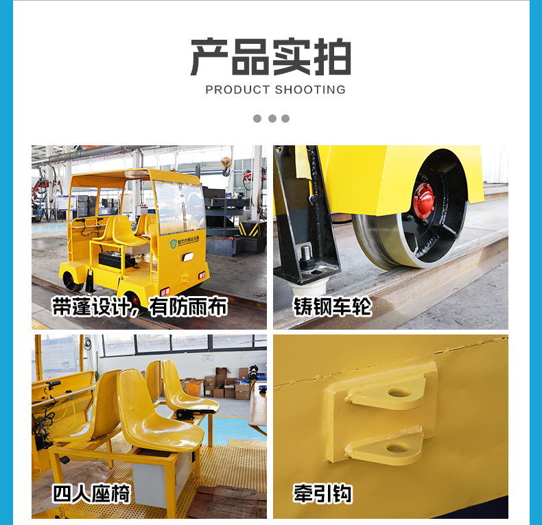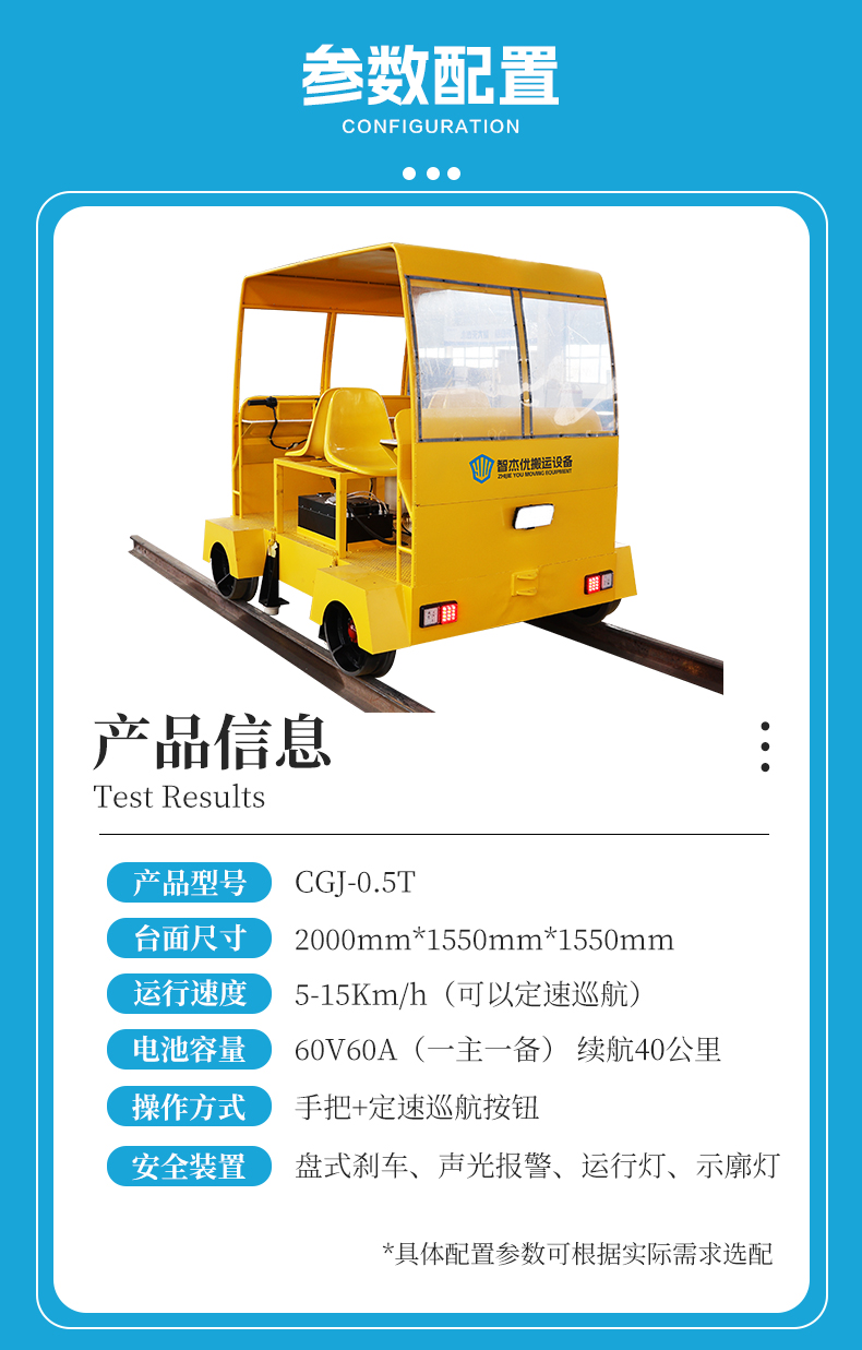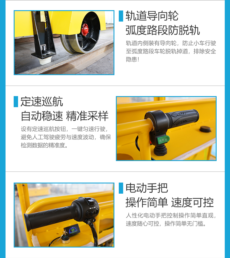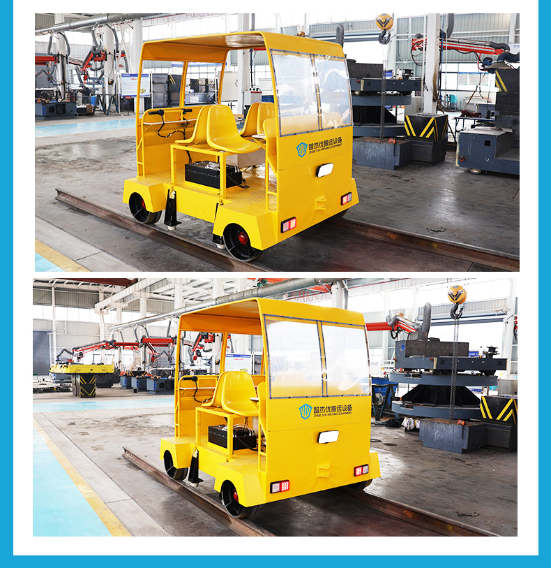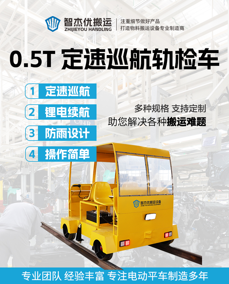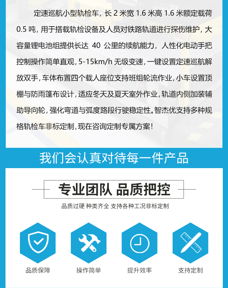 热线:15517329551 这是一台定速巡航小型轨检车,长2米宽1.6米高1.6米额定载荷0.5吨,用于搭载轨检设备及人员对铁路轨道进行探伤维护,大容量锂电池组提供长达40公里的续航能力,人性化电动手把控制操作简单直观,5-15km/h无级变速,一键设置定速巡航解放双手,车体布置四个载人座位支持班组轮流作业,小车设置顶棚与防雨篷布设计,适应冬天及夏天室外作业,轨道内侧加装辅助导向轮,强化弯道与弧度路段行驶稳定性。