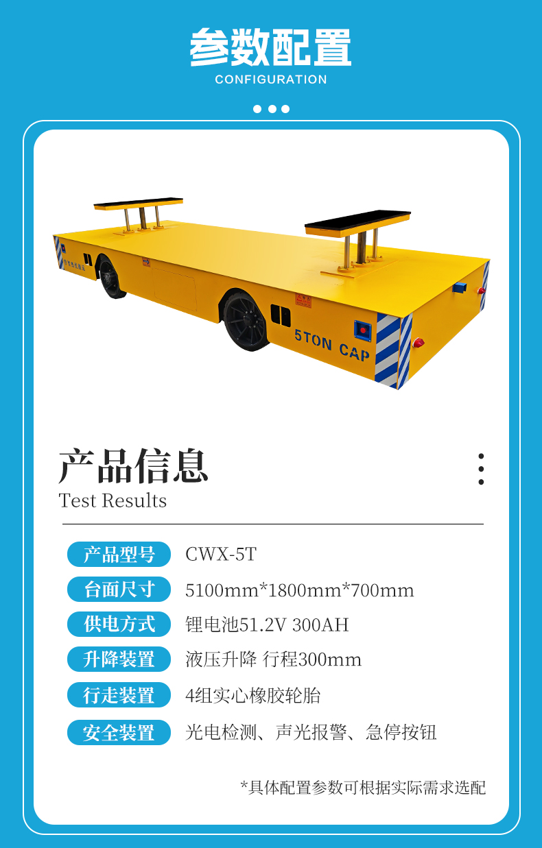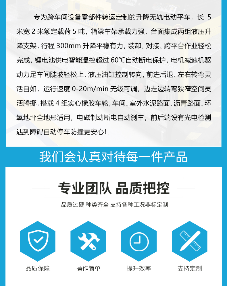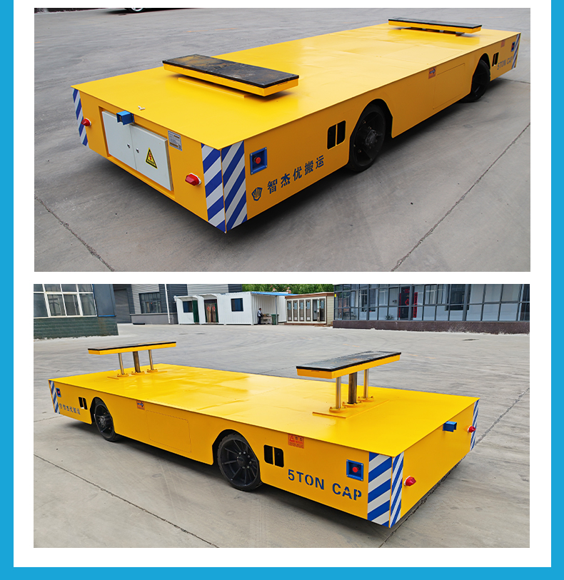 热线:15517329551 专为跨车间设备零部件转运定制的升降无轨电动平车,长5米宽2米额定载荷5吨,箱梁车架承载力强,台面集成两组液压升降支架,行程300mm升降平稳有力,装卸、对接、跨平台作业轻松完成,锂电池供电智能温控超过60℃自动断电保护,电机减速机驱动力足车间陡坡轻松上,液压油缸控制转向,前进后退、左右转弯灵活自如,运行速度0-20m/min无级可调,边走边转弯狭窄空间灵活腾挪,搭载4组实心橡胶车轮,车间、室外水泥路面、沥青路面、环氧地坪全地形适用,电磁制动断电自动刹车,前后端设有光电检测遇到障碍自动停车防撞更安心!