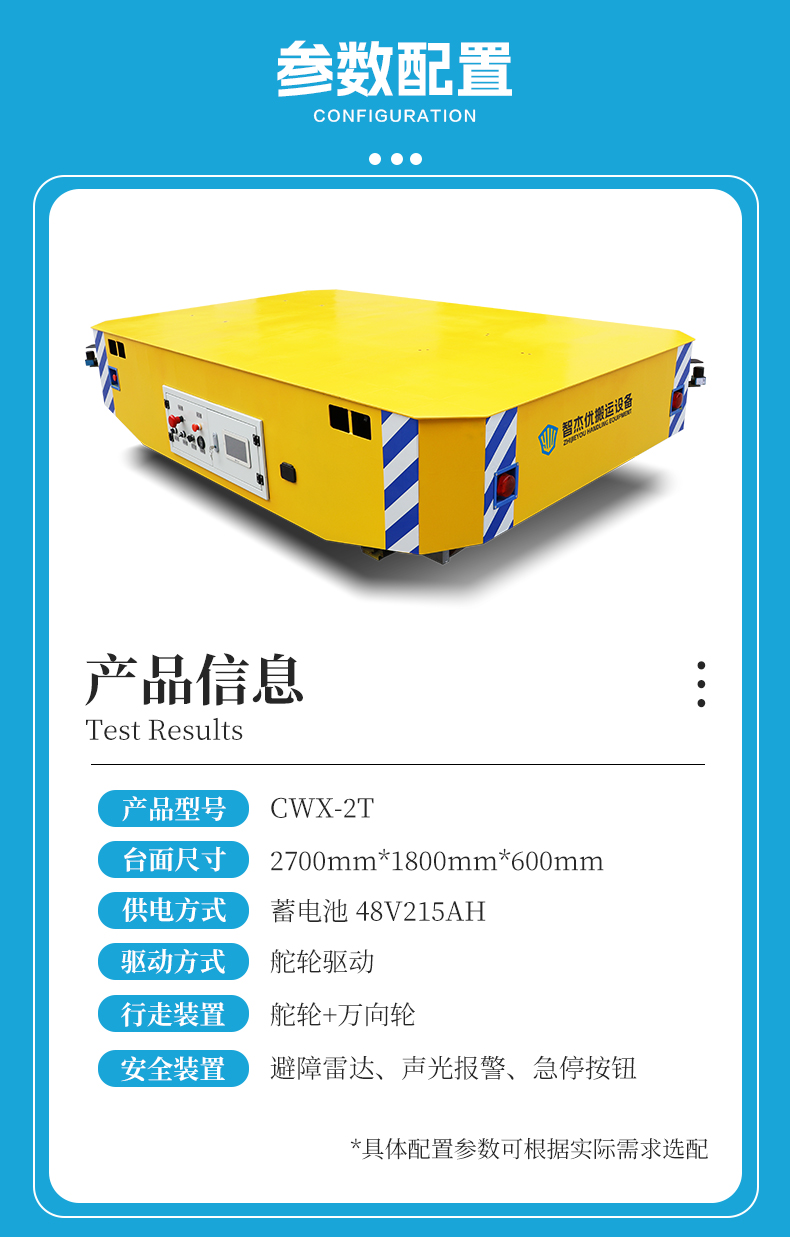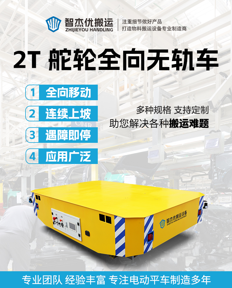 描   述: 舵轮全向无轨车,全向移动车间转运不绕路,驱动力足轻松上坡不费劲,2吨载荷转运重型工件、模具、半成品等轻松不费力,还有避障雷达全程保驾护航,是小空间、多工况转运的王炸神器!