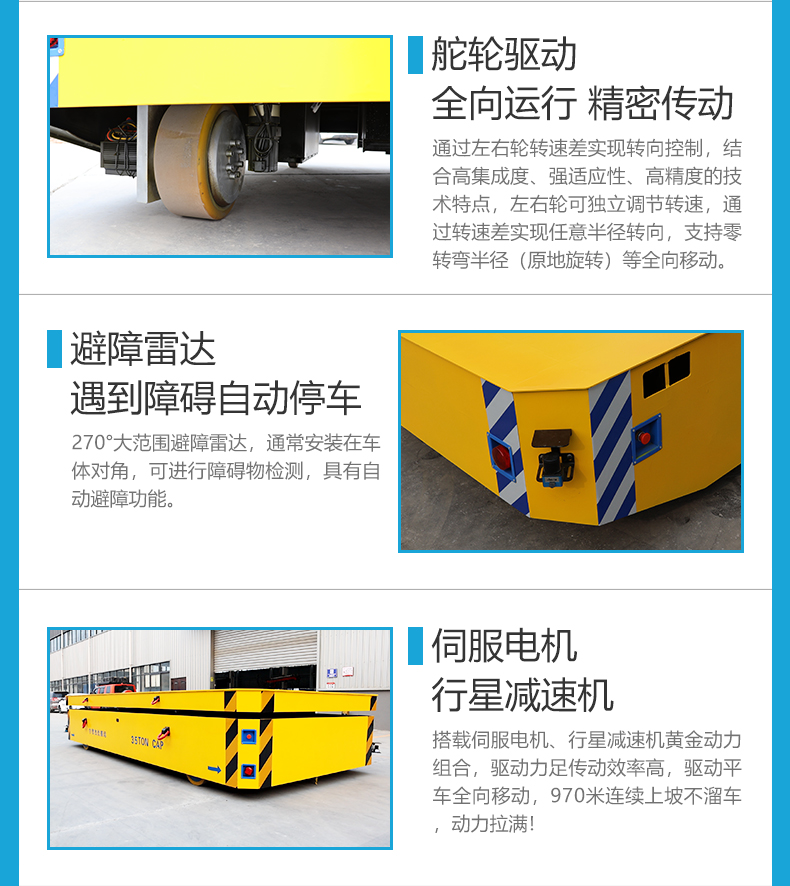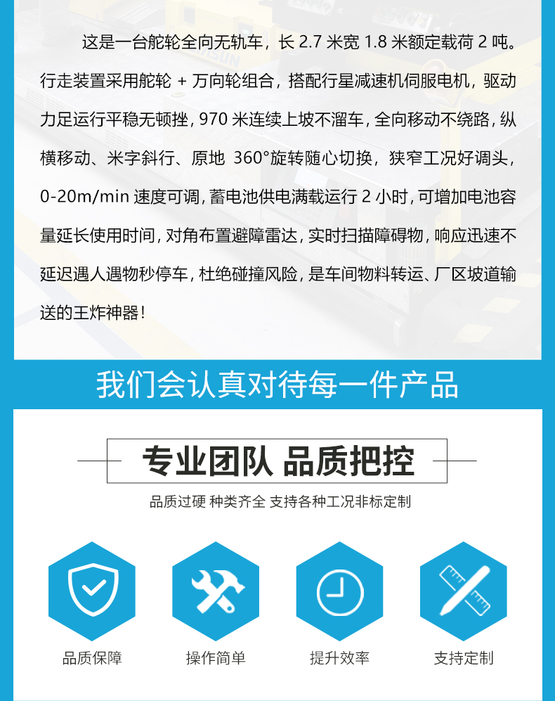 这是一台舵轮全向无轨车,长2.7米宽1.8米额定载荷2吨。行走装置采用舵轮+万向轮组合,搭配行星减速机伺服电机,驱动力足运行平稳无顿挫,970米连续上坡不溜车,全向移动不绕路,纵横移动、米字斜行、原地360°旋转随心切换,狭窄工况好调头,0-20m/min速度可调,蓄电池供电满载运行2小时,可增加电池容量延长使用时间,对角布置避障雷达,实时扫描障碍物,响应迅速不延迟遇人遇物秒停车,杜绝碰撞风险,是车间物料转运、厂区坡道输送的王炸神器!