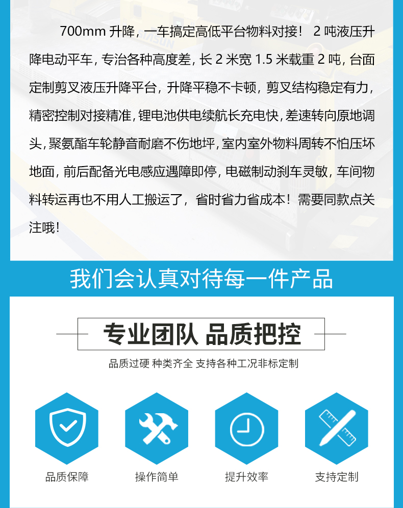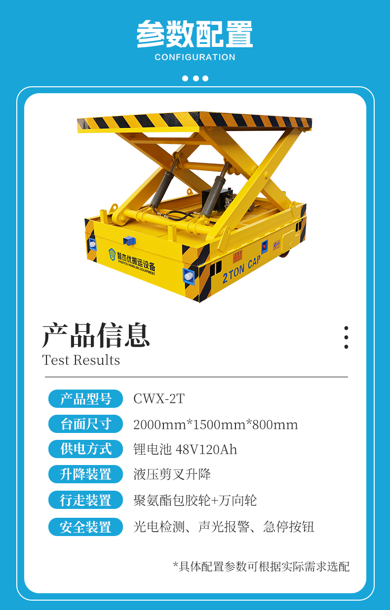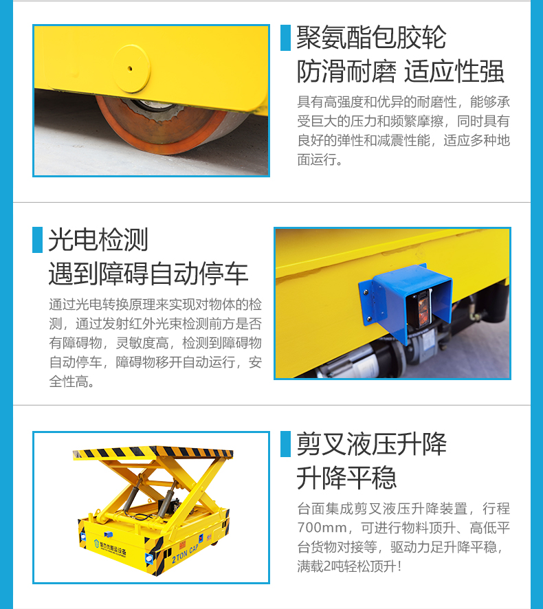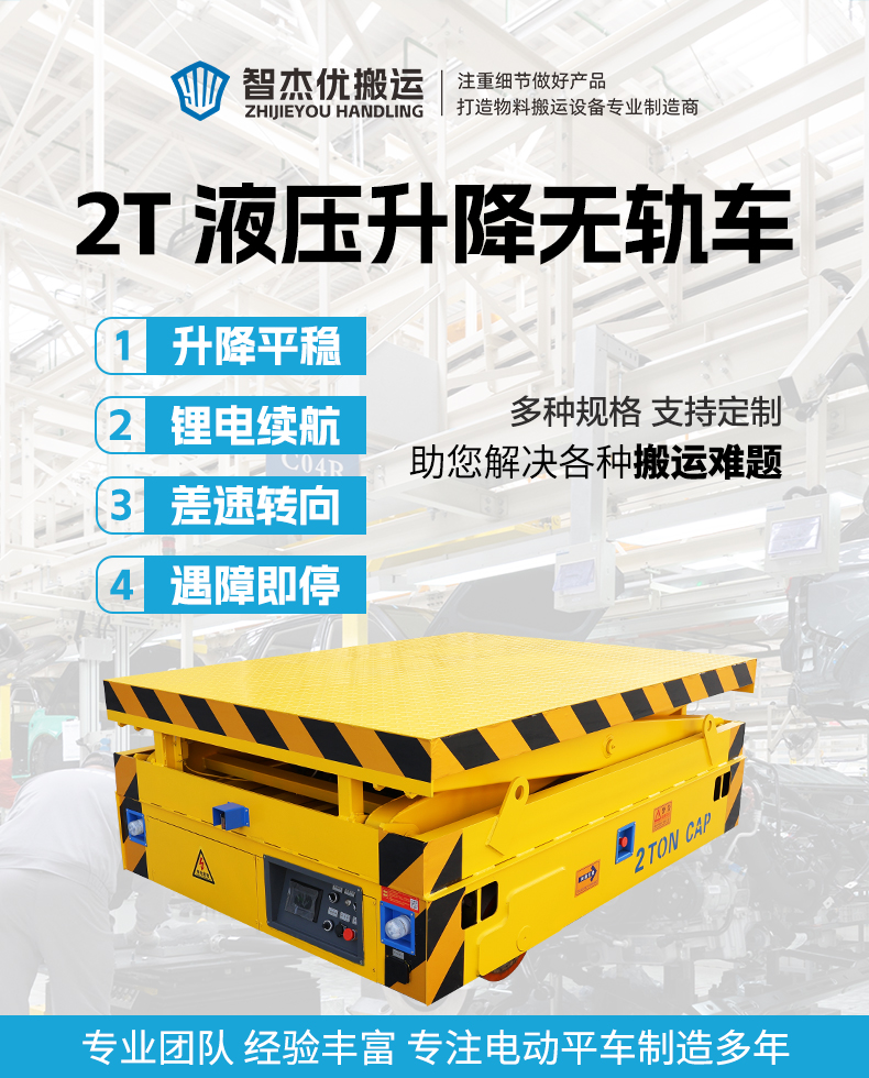 热线:15517329551 700mm升降,一车搞定高低平台物料对接!2吨液压升降电动平车,专治各种高度差,长2米宽1.5米载重2吨,台面定制剪叉液压升降平台,升降平稳不卡顿,剪叉结构稳定有力,精密控制对接***,锂电池供电续航长充电快,差速转向原地调头,聚氨酯车轮静音耐磨不伤地坪,室内室外物料周转不怕压坏地面,前后配备光电感应遇障即停,电磁制动刹车灵敏,车间物料转运再也不用人工搬运了,省时省力省成本!