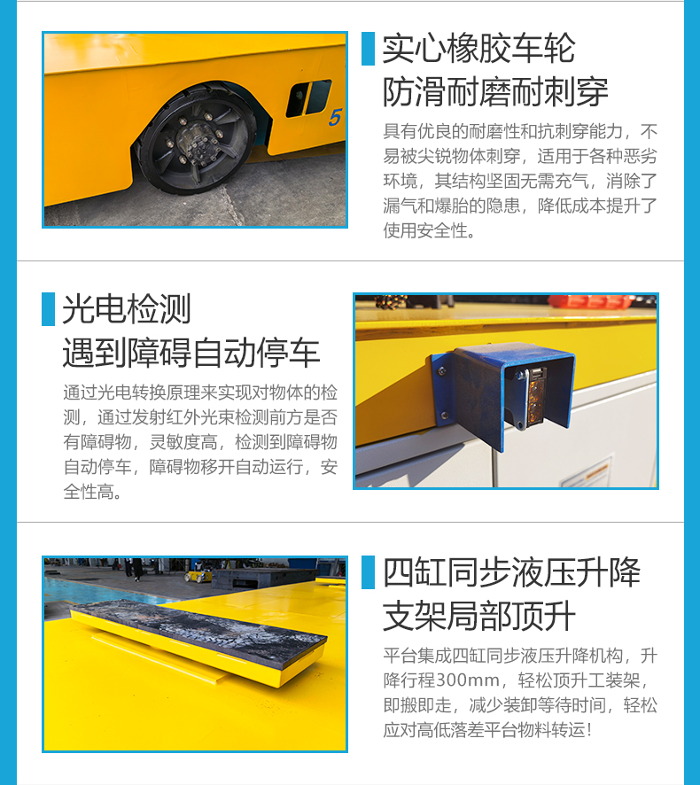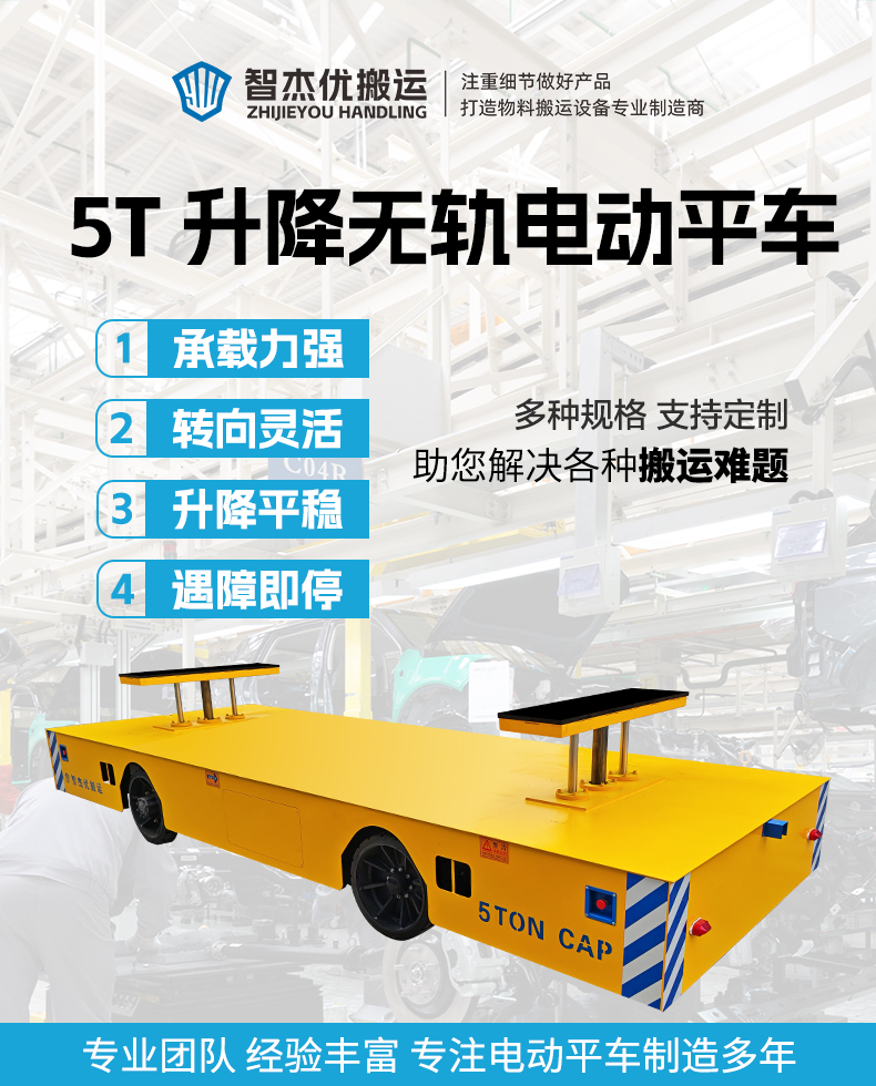 热线:15517329551 专为跨车间设备零部件转运定制的升降无轨电动平车,长5米宽2米额定载荷5吨,箱梁车架承载力强,台面集成两组液压升降支架,行程300mm升降平稳有力,装卸、对接、跨平台作业轻松完成,锂电池供电智能温控超过60℃自动断电保护,电机减速机驱动力足车间陡坡轻松上,液压油缸控制转向,前进后退、左右转弯灵活自如,运行速度0-20m/min无级可调,边走边转弯狭窄空间灵活腾挪,搭载4组实心橡胶车轮,车间、室外水泥路面、沥青路面、环氧地坪全地形适用,电磁制动断电自动刹车,前后端设有光电检测遇到障碍自动停车防撞更安心!