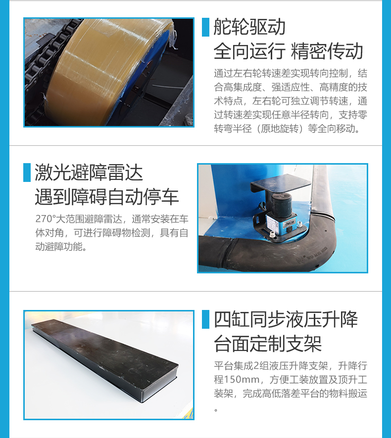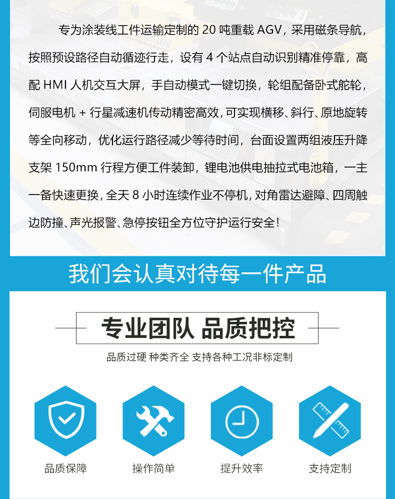 热线:15517329551 专为涂装线工件运输定制的20吨重载AGV,采用磁条导航,按照预设路径自动循迹行走,设有4个站点自动识别***停靠,高配HMI人机交互大屏,手自动模式一键切换,轮组配备卧式舵轮,伺服电机+行星减速机传动精密高效,可实现横移、斜行、原地旋转等全向移动,优化运行路径减少等待时间,台面设置两组液压升降支架150mm行程方便工件装卸,锂电池供电抽拉式电池箱,一主一备快速更换,全天8小时连续作业不停机,对角雷达避障、四周触边防撞、声光报警、急停按钮全方位守护运行安全!