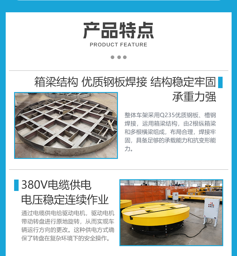 描   述: 车间内大型工件运输车掉头换向难,人工推不动?快来看看这款专为大型地平车、轨道运输车辆量身定制的智能转向电动转盘,直径载重功能通通支持非标定制!