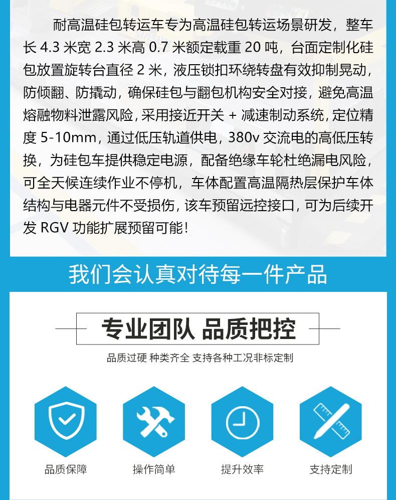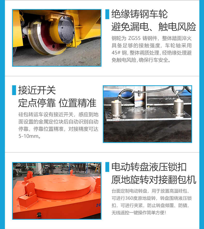 描   述: 耐高温硅包转运车专为高温硅包转运场景研发,整车长4.3米宽2.3米高0.7米额定载重20吨,台面定制化硅包放置旋转台直径2米,液压锁扣环绕转盘有效抑制晃动,防倾翻、防撬动,确保硅包与翻包机构安全对接,避免高温熔融物料泄露风险,采用接近开关+减速制动系统,定位精度5-10mm,通过低压轨道供电,380v交流电的高低压转换,为硅包车提供稳定电源,配备绝缘车轮杜绝漏电风险,可全天候连续作业不停机!