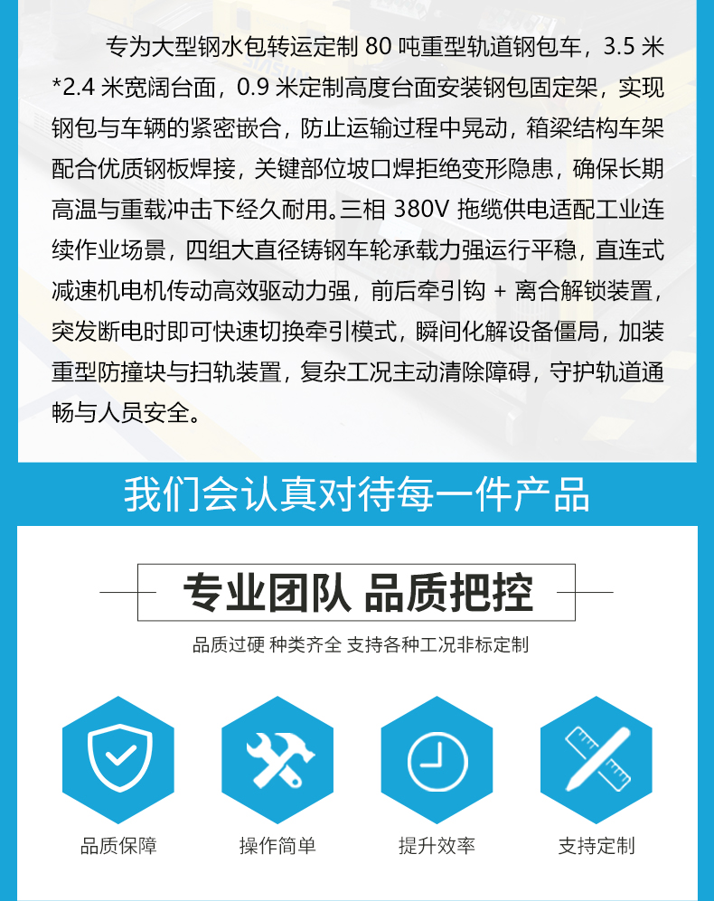 描   述: 专为高温工况大型钢水包转运定制的80吨重型轨道钢包车,2.5米*2.4米台面载重80吨稳稳当当,箱梁车架钢板焊接,高温重压不变形,380V拖缆供电24小时连续干活不停机,配备离合装置,突发停电时松开离合就能牵引挪车,防撞块、轨道清扫装置配置齐全,扛得住高温、经得起重压、故障率低安全省心,有它在,钢水转运 so easy!