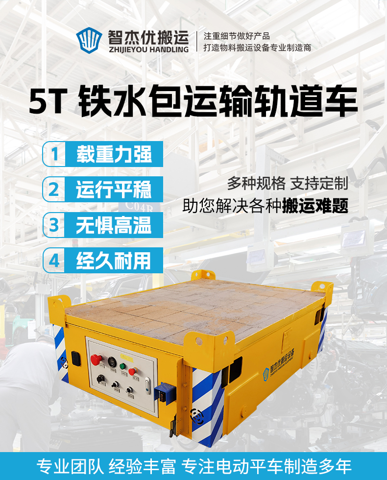 描   述: 在铸造车间高温熔融物料如何安全高效进行转运?这台耐高温轨道运输平板车为您提供解决方案。平台加铺耐火砖有效抵御高温烘烤,5吨额定载荷,可进行铁水包、钢水包、钢渣盆等重型物料轻松转运,蓄电池供电续航按需定制,操作简单维护方便,多重安全防护保障物料运输安全高效!
