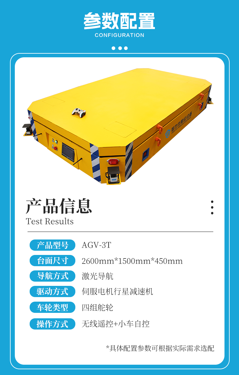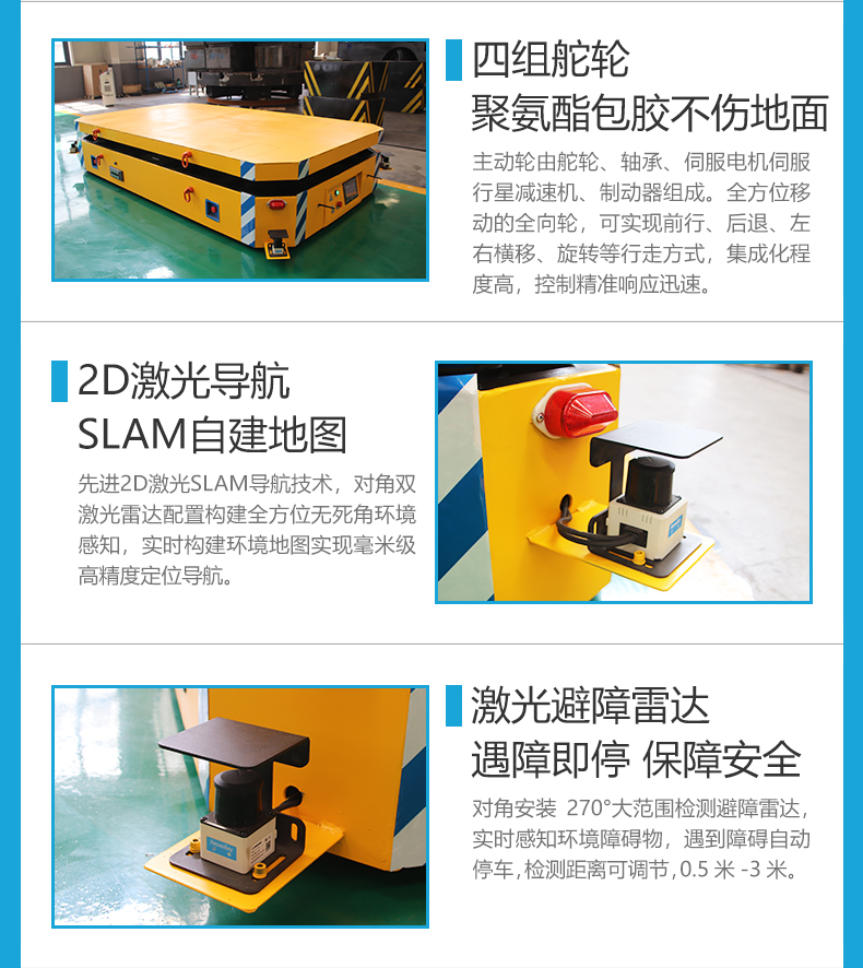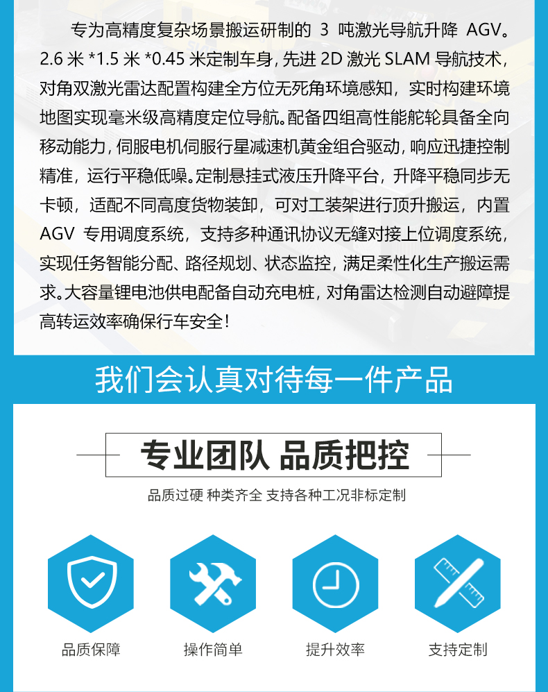 描   述: 3吨激光导航升降AGV,2.6米*1.5米*0.45米定制车身,***2D激光SLAM导航技术,对角双激光雷达配置构建全方位无死角环境感知,实时构建环境地图实现毫米级高精度定位导航。