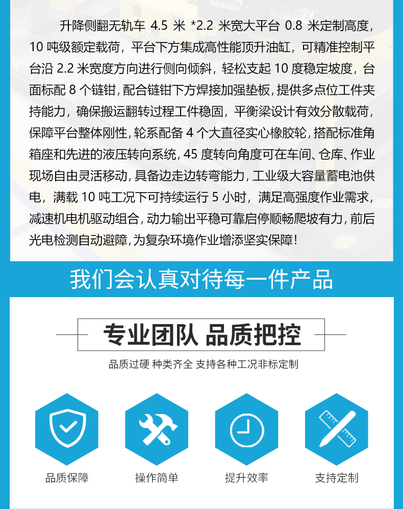 描   述: 升降侧翻无轨车4.5米*2.2米宽大平台0.8米定制高度,10吨级额定载荷,平台下方集成高性能顶升油缸,可***控制平台沿2.2米宽度方向进行侧向倾斜,轻松支起10度稳定坡度,台面标配8个链钳,提供多点位工件夹持能力,确保搬运翻转过程工件稳固,平衡梁设计有效分散载荷,轮系配备4个大直径实心橡胶轮,45度转向角度可在车间、仓库、作业现场自由灵活移动,具备边走边转弯能力,大容量蓄电池供电满载10吨工况下