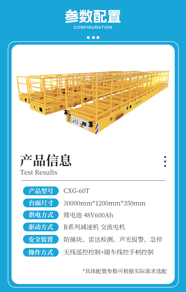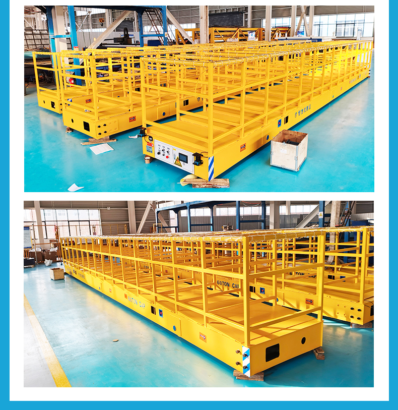 描   述: 为重型门架量身打造,整车长30米,采用三段模块化设计,可无缝连接形成一个稳固的运输平台,额定载荷60吨,三段车体通过高强度专用连接件快速组合,灵活适应现场轨道布局,台面分格设计,单个格间工位称重1.5吨,搭载高性能锂电池供电系统,一次充电满足长时间转运需求!