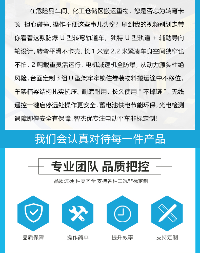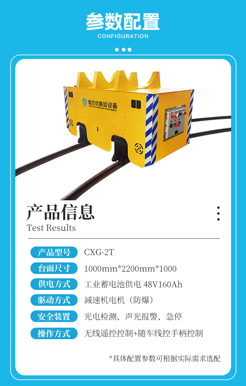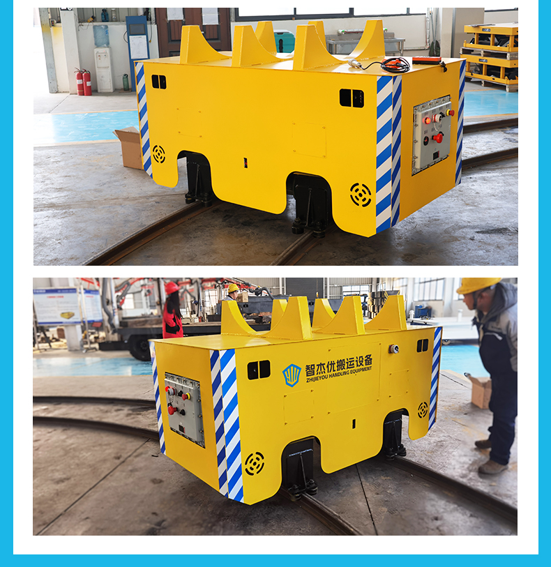 带你看看这款防爆U型转弯轨道车,独特U型轨道+辅助导向轮设计,转弯平滑不卡壳,长1米宽2.2米紧凑车身空间狭窄也不怕,2吨载重灵活运行,电机减速机全防爆,从动力源头杜绝风险,台面定制3组U型架牢牢锁住卷装物料搬运途中不移位,车架箱梁结构扎实抗压、耐磨耐用,长久使用“不掉链”,无线遥控一键启停远处操作更安全,蓄电池供电节能环保,光电检测遇障即停安全有保障!