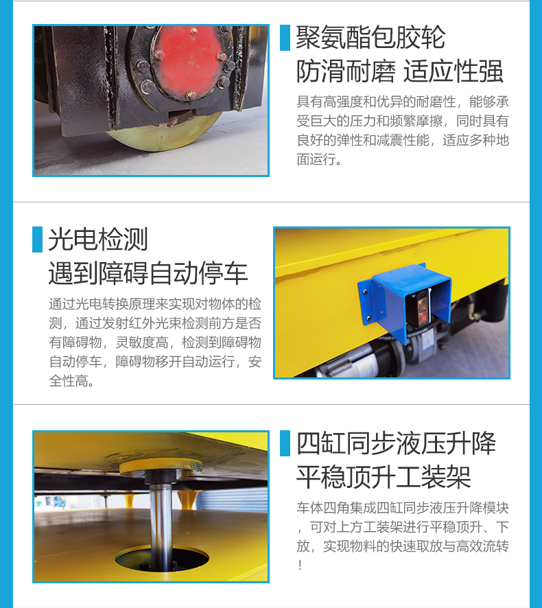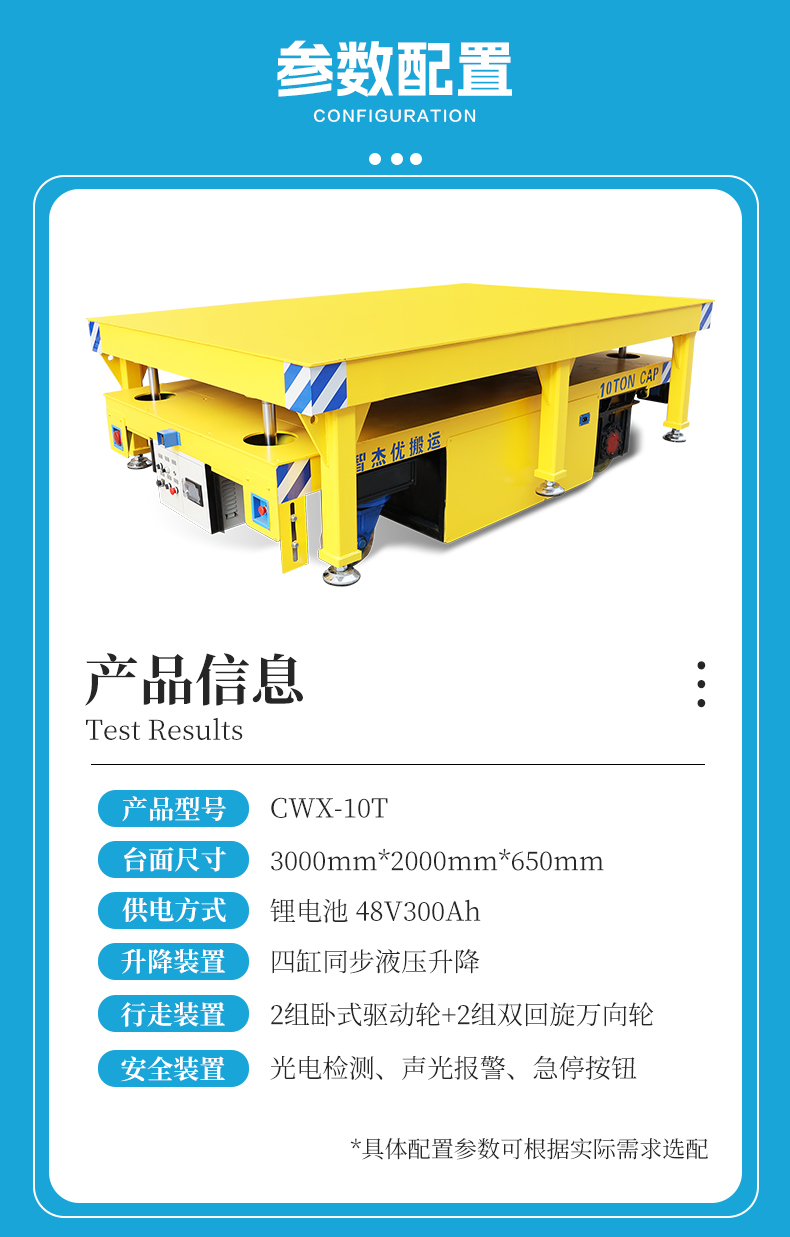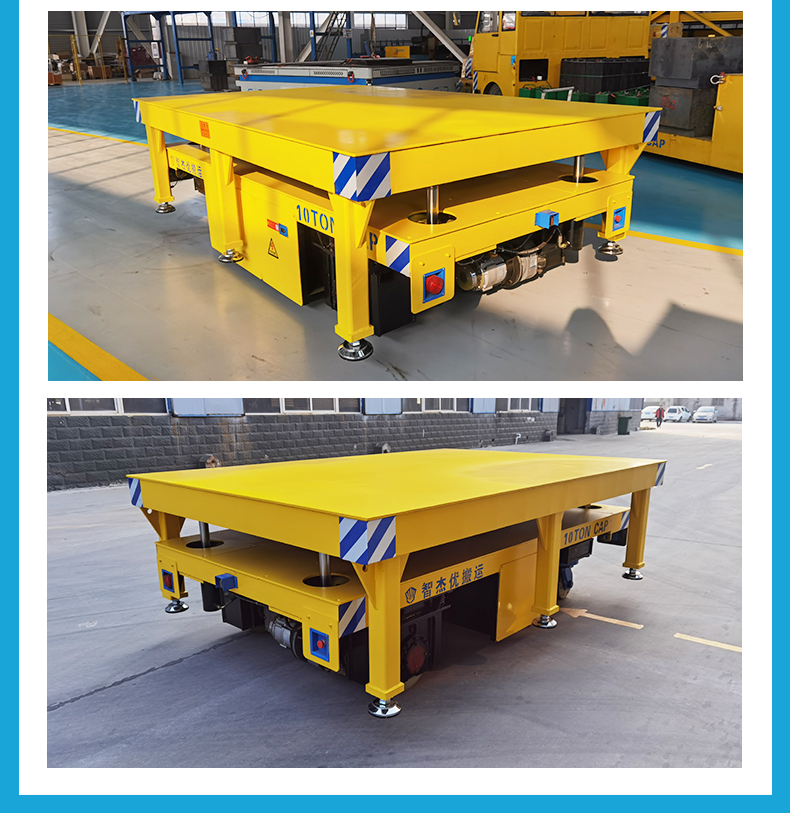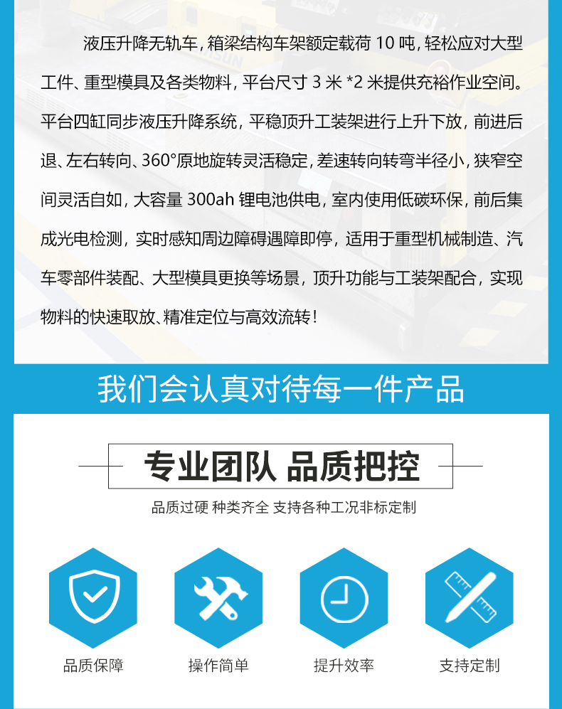 这是一台液压升降无轨车,箱梁结构车架额定载荷10吨,轻松应对大型工件、重型模具及各类物料,平台尺寸3米*2米提供充裕作业空间。平台四缸同步液压升降系统,平稳顶升工装架进行上升下放,前进后退、左右转向、360°原地旋转灵活稳定,差速转向转弯半径小,狭窄空间灵活自如,大容量300ah锂电池供电,室内使用低碳环保,前后集成光电检测,实时感知周边障碍遇障即停,适用于重型机械制造、汽车零部件装配、大型模具更换等场景,顶升功能与工装架配合,实现物料的快速取放、***定位与高效流转!
