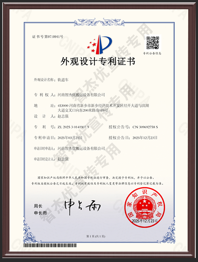 热烈祝贺!智杰优“电动平车(隧道搬运)”外观设计专利获批