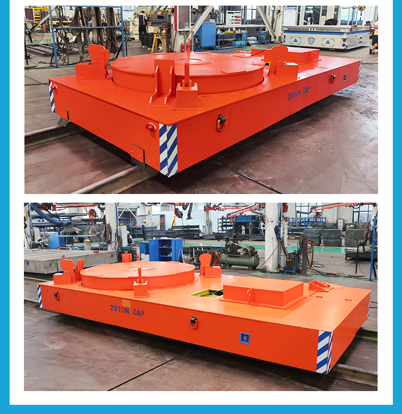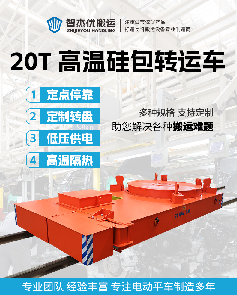 描   述: 耐高温硅包转运车专为高温硅包转运场景研发,整车长4.3米宽2.3米高0.7米额定载重20吨,台面定制化硅包放置旋转台直径2米,液压锁扣环绕转盘有效抑制晃动,防倾翻、防撬动,确保硅包与翻包机构安全对接,避免高温熔融物料泄露风险,采用接近开关+减速制动系统,定位精度5-10mm,通过低压轨道供电,380v交流电的高低压转换,为硅包车提供稳定电源,配备绝缘车轮杜绝漏电风险,可全天候连续作业不停机!