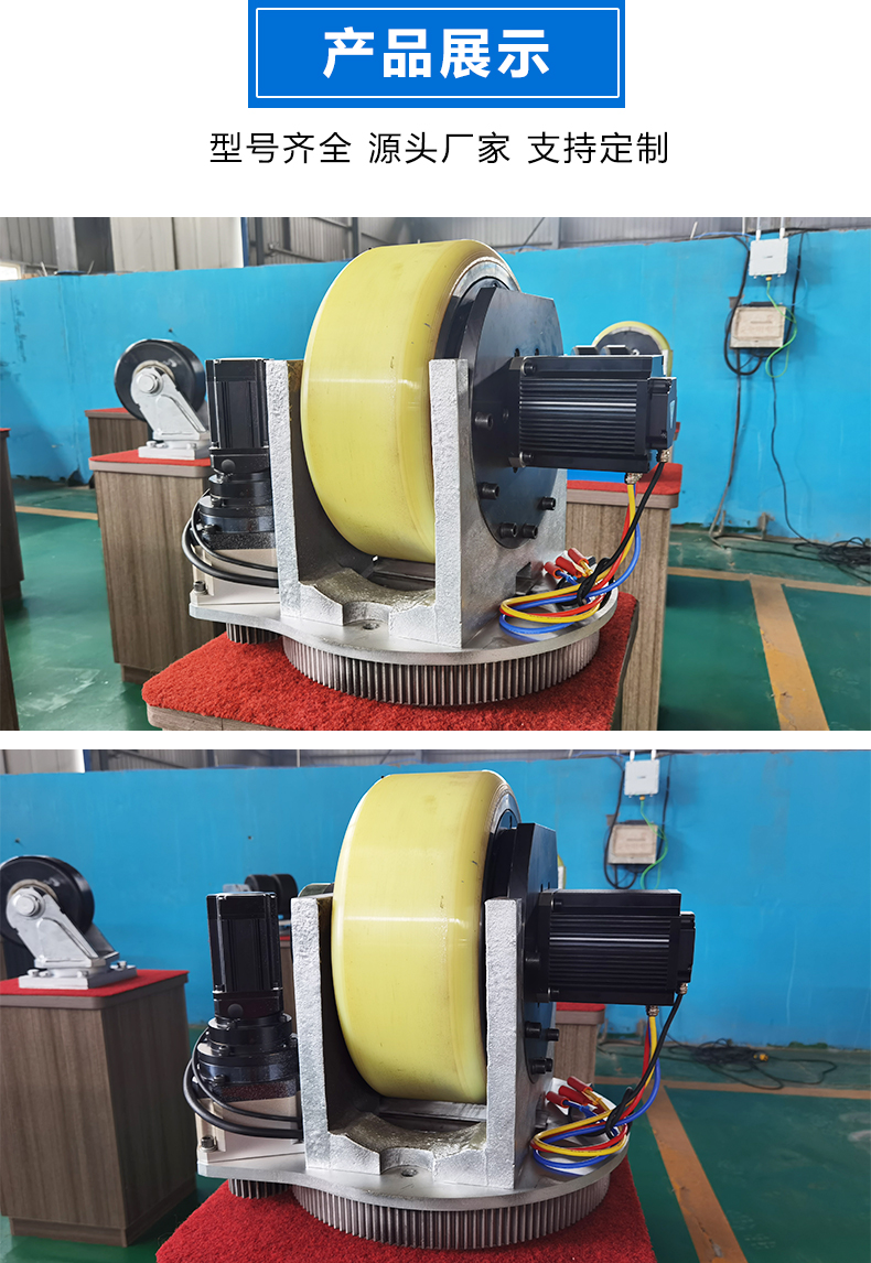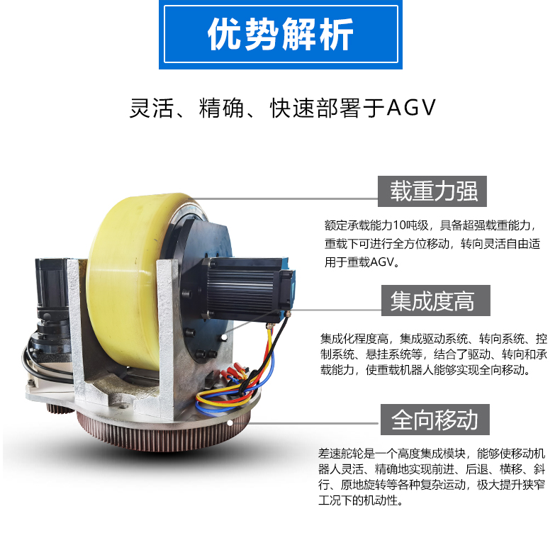 描   述: 6吨级重载卧式舵轮,集成驱动、转向、称重三大功能于一体,额定负载高达6吨,轻松驱动大型物料、重型设备,满足冶金、重型机械等行业高强度运输需求。卧式结构深度优化安装空间,显著降低AGV底盘高度,轻松穿越低矮区域提升空间利用率。支持±90°甚至更大角度转向,实现零半径转弯、侧移、斜行等高阶运动。
