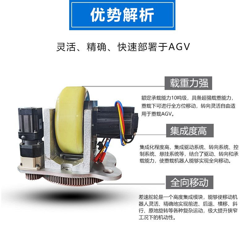 描   述: 4.5吨级重载卧式舵轮,集成驱动、转向、称重三大功能于一体,额定负载高达4.5吨,轻松驱动大型物料、重型设备,满足冶金、重型机械等行业高强度运输需求。卧式结构深度优化安装空间,显著降低AGV底盘高度,轻松穿越低矮区域提升空间利用率。支持±90°甚至更大角度转向,实现零半径转弯、侧移、斜行等高阶运动!