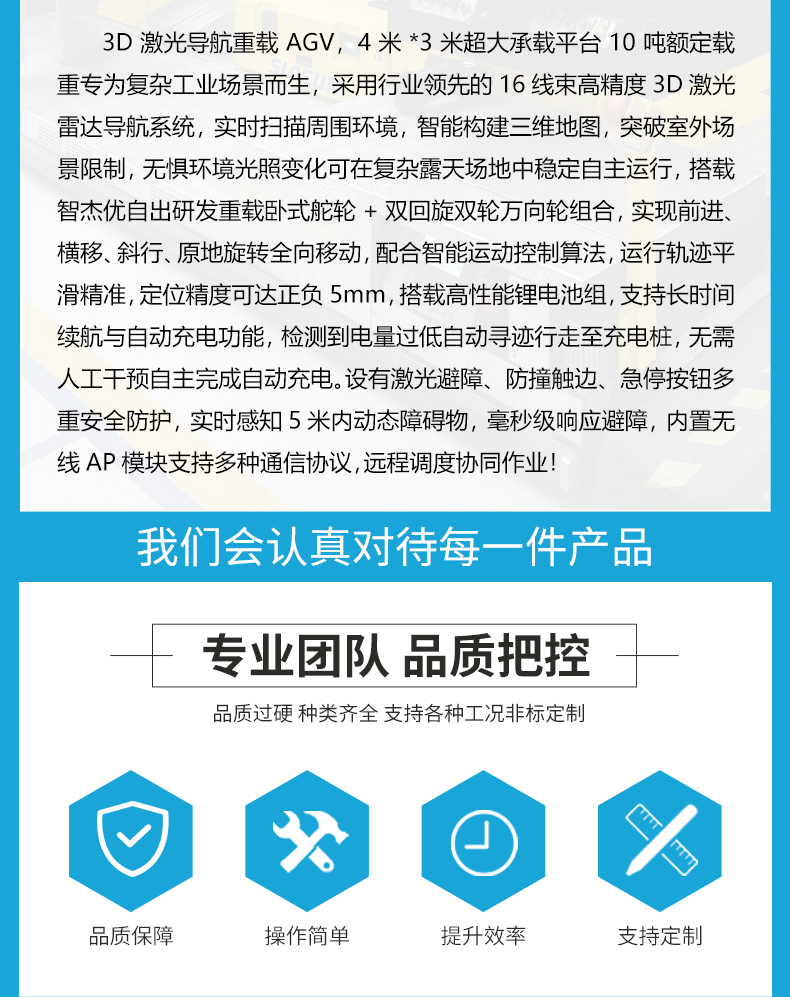 描   述: 3D激光导航重载AGV,4米*2米超大承载平台10吨额定载重专为复杂工业场景而生,采用行业***的16线束高精度3D激光雷达导航系统,实时扫描周围环境,智能构建三维地图,突破室外场景限制,无惧环境光照变化可在复杂露天场地中稳定自主运行,搭载智杰优自出研发重载卧式舵轮+双回旋双轮万向轮组合,实现前进、横移、斜行、原地旋转全向移动,配合智能运动控制算法,运行轨迹平滑***,定位精度可达正负5mm。