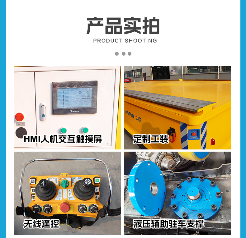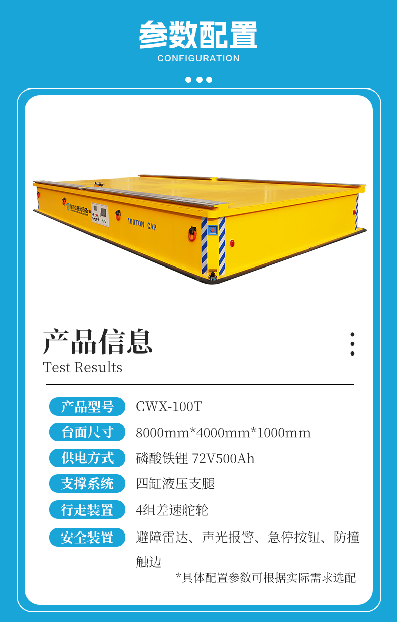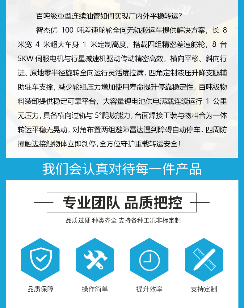 智杰优100吨差速舵轮全向无轨搬运车提供解决方案,长8米宽4米超大车身1米定制高度,搭载四组精密差速舵轮,8台5KW伺服电机与行星减速机驱动传动精密高效,横向平移、斜向行进、原地零半径旋转全向运行灵活度拉满,四角定制液压升降支腿辅助驻车支撑,减少轮组压力增加使用寿命提升停靠稳定性,百吨级物料装卸提供稳定可靠平台,大容量锂电池供电满载连续运行1公里无压力,具备横向过轨与5°爬坡能力,台面焊接工装与物料合为一体转运平稳无晃动,对角布置两组避障雷达遇到障碍自动停车,四周防撞触边接触物体立即刹停,全方位守护重载转运安全!