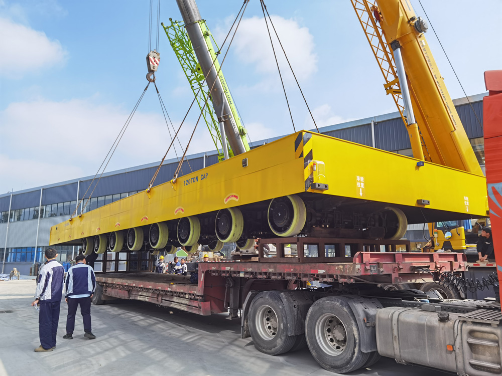 近日,天津客户定制的120吨大型重载无轨电动平车正式交付发往客户现场。此次交付的无轨转运车体量惊人,长达15米宽达5米,其核心结构采用高强度整体车架与精密钢板焊接技术,确保在承受120吨极限载荷时,车体依然稳定牢固。