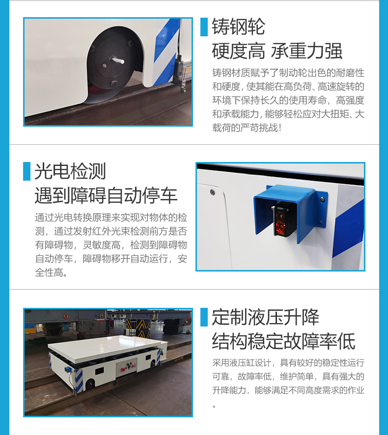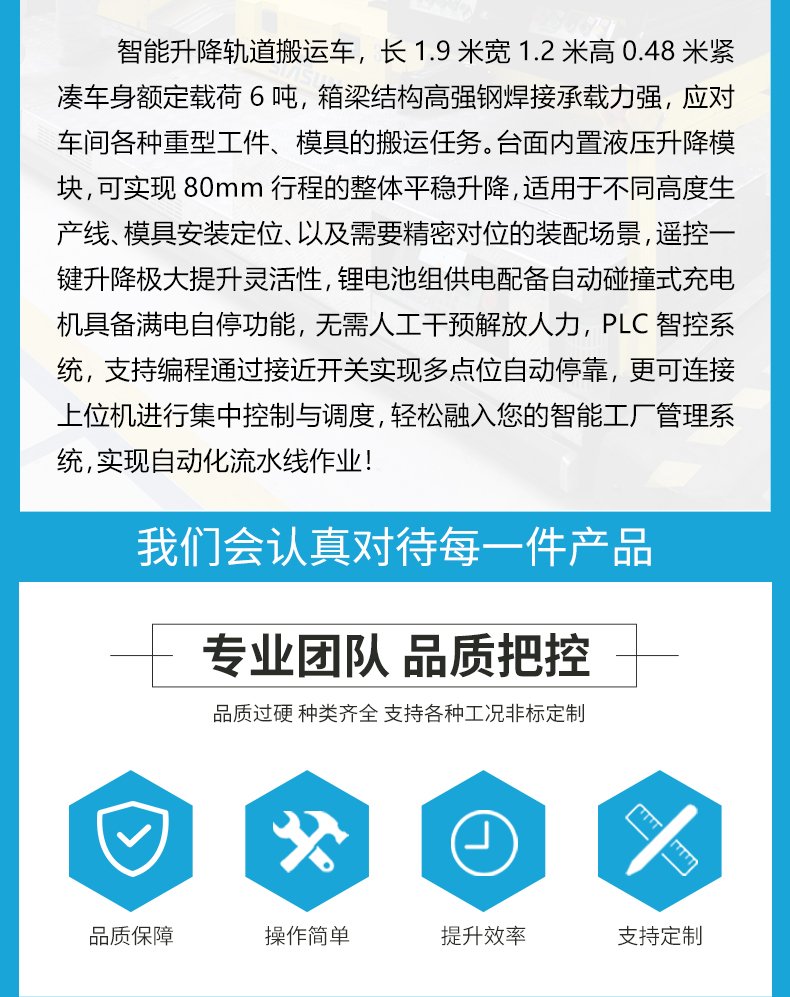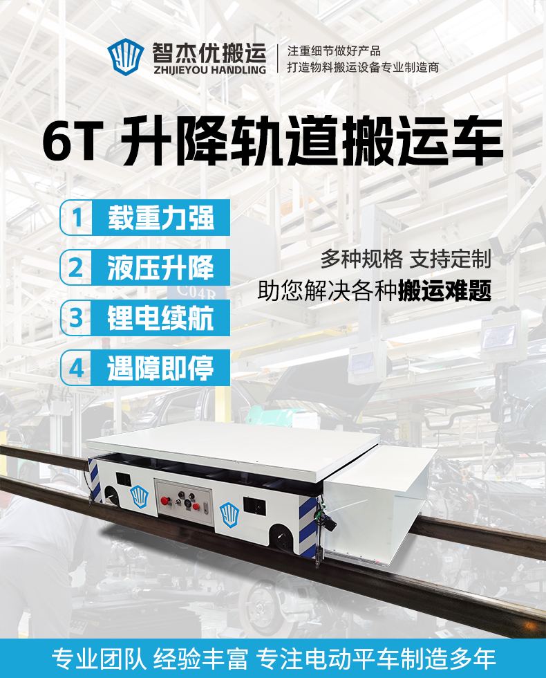 描   述: 6吨升降式轨道搬运车,长1.9米宽1.2米高0.48米定制化紧凑车身,坚固箱梁结构承载力强稳定牢固,长期使用不变形不塌陷,无线遥控操作简单便捷,台面定制升降模块只进行高低场景的物料搬运,极大提升灵活性与生产效率!